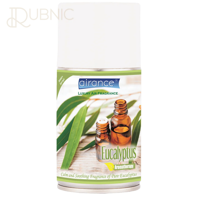 Intensity Of Fragrance Eucalyptus(Nilgiri) : Light To Medium • Fragrance Eucalyptus(Nilgiri) : Aroma of 100% Pure & Natural Eucalyptus (Nilgiri) Essential Oil • Airance is a Luxury Air Fragrance Brand Available in India. Airance Luxury Air Fragrances 1. Features • Most of the Airance Fragrances contain natural ethereal oils extracted from plants and leaves through steam distillation process. Since ancient times, they have been known to have a great positive impact on mind and body • Airance fragrances have a unique formula for "Odour Absorber". It instantly de-activates molecules of compounds that cause malodours • Airance fragrance bottles are 250 ML & have 3000+ sprays, which makes it lasts for upto 6 months or more depending upon the frequency of the use • Airance Fragrance Bottles can be used with almost all the available dispensers in the market which use 250 ml refill bottle • Airance Fragrance can also be sprayed by hand also in cars etc. • Instantaneous, Effective and Long Lasting Air Fragrance. • Eliminates Airborne Bacteria, Odours and fragrances the ambience 24 x 7. 3.Area Covered • Airance Fragrances have highly effective aromatic ethereal oils which remain in the atmosphere for a longer time and are effective in areas upto 600 sq.ft (or 6000 cubic feet) with a ceiling height of 10 sq.ft. 4.Safety Standards • No CFC • Manufactured under Best European Health Safety Standards • Special Anti Bacterial Formula • Non Toxic
