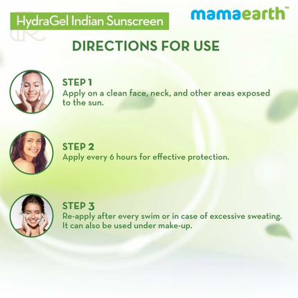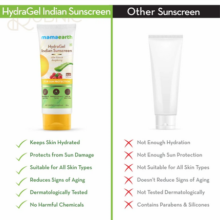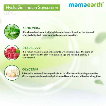 We all know the damaging effects of the sun. Harmful UVA & UVB rays cause long term skin damage like sunburn, dark spots, dry and itchy skin. What’s the solution? Avoid sun damage by using a sunscreen that not only protects but also hydrates! Mamaearth HydraGel Indian Sunscreen is made keeping in mind the needs of Indian skin. The gel-based formula with SPF 50 soothes the skin while protecting it from the harmful rays of the sun. Aloe Vera in the sunscreen has high anti-inflammatory properties and is extremely soothing. It also contains Raspberries that rejuvenate the skin and reverse signs of aging, such as fine lines, dark spots, and wrinkles. The light and non-greasy gel formula protects your skin from sun damage and also keeps it hydrated. The product is dermatologically tested and is suitable for all skin types. It contains no Parabens, mineral oils, or harmful chemicals, and is 100% safe to add to your daily skin regimen.