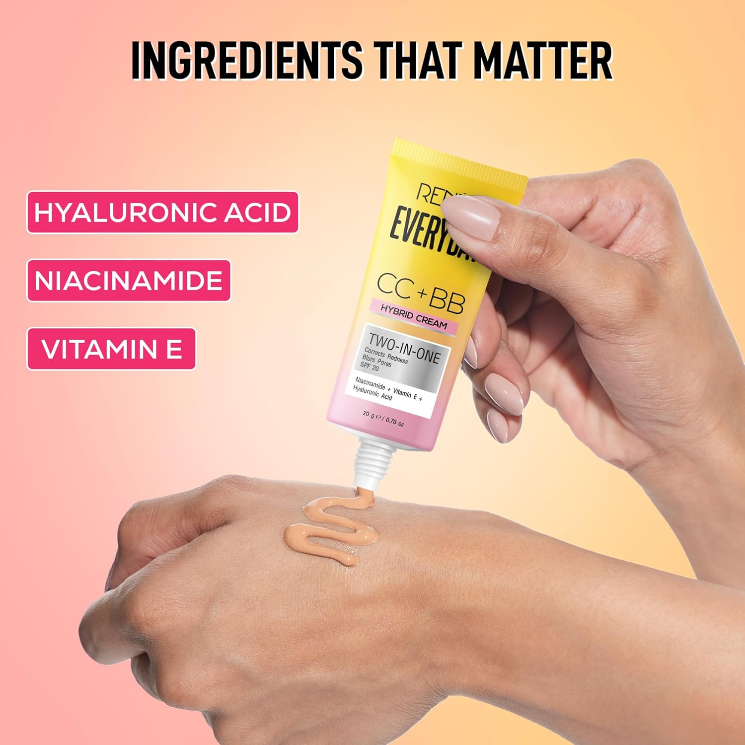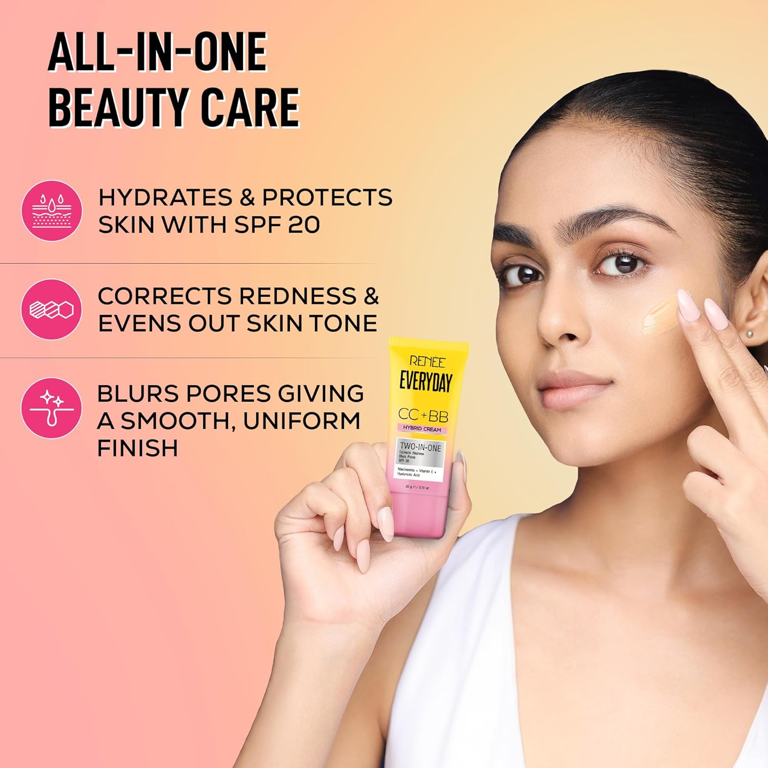 Elevate your beauty routine with the RENEE Everyday CC + BB Hybrid Cream with SPF 20. This innovative cream blends the benefits of a CC cream and a BB cream into one multitasking formulation. With the ability to hydrate, correct, and protect, this cream is perfect for daily use, making it a must-have in your skincare collection.