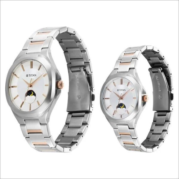 Discover the exquisite Titan Bandhan Quartz Analog Sun-Moon Silver Dial Two Toned Stainless Steel Strap Watch For Couple, a stunning couple watch set designed to embody elegance and sophistication. This luxurious duo is perfect for couples seeking to celebrate their love with style. The combination of silver and rose gold tones radiates a modern charm that is versatile enough for any occasion.