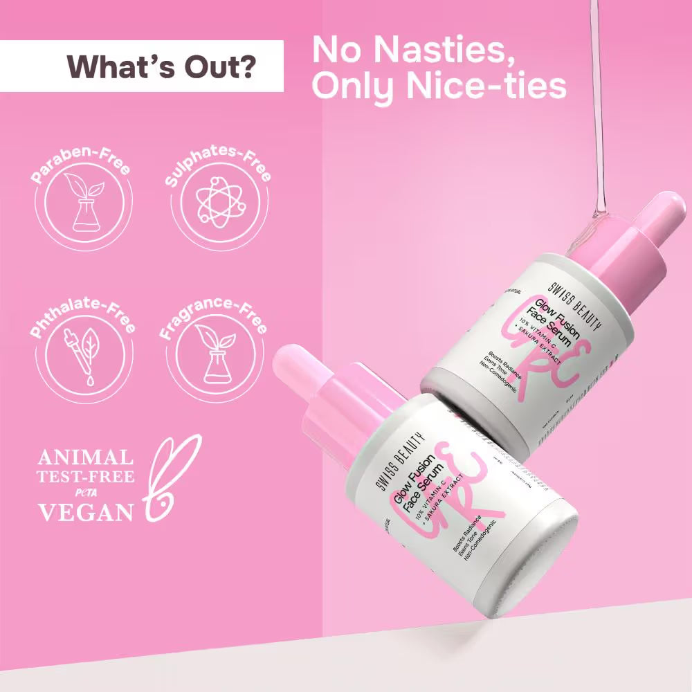 The Swiss Beauty Care Glow Fusion Face Serum is free from harsh chemicals. It is free from parabens, sulphates, phthalates, and is completely cruelty-free, ensuring you can glow without any guilt.