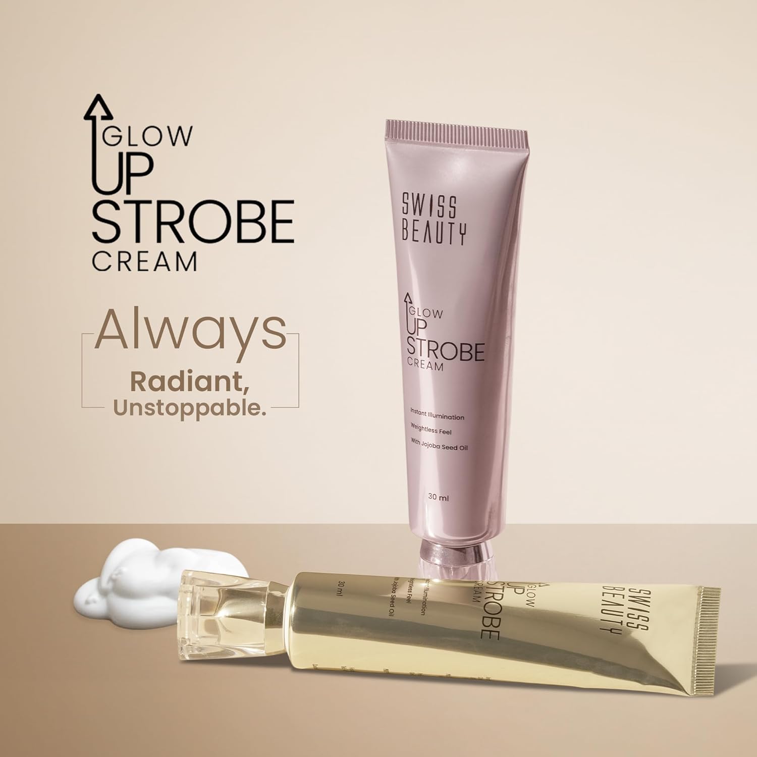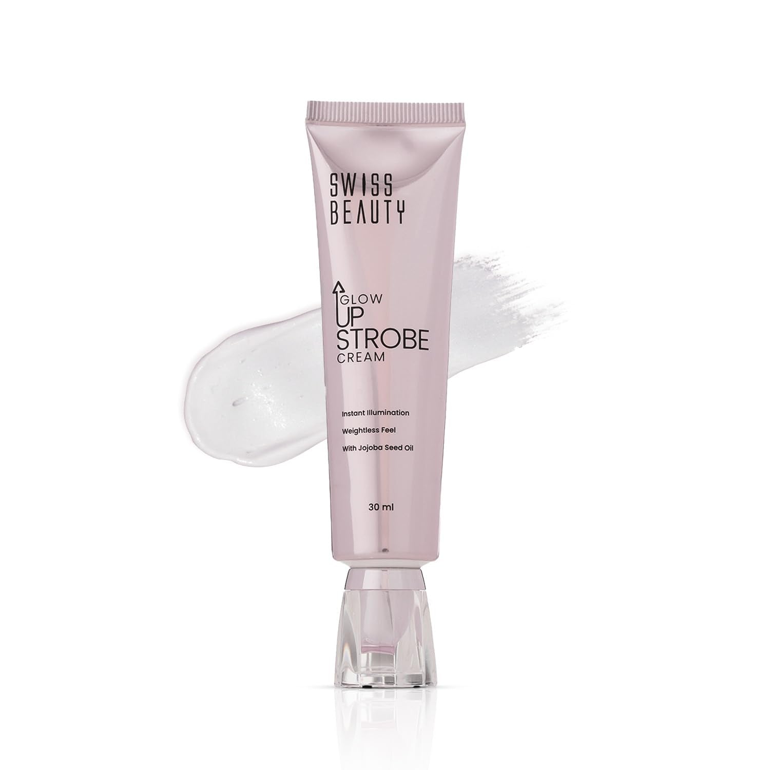 Bring out your inner radiance with Swiss Beauty Glow Up Strobe Cream, your ultimate glow booster that bridges the gap between skincare and makeup. This lightweight, non-sticky formula is enriched with Jojoba Seed Oil, delivering a burst of hydration while leaving your skin soft, smooth, and refreshed. Infused with fine pearl particles, it gives your complexion a naturally dewy, lit-from-within glow that looks stunning in every light. Versatile and buildable, this strobe cream is designed to be your go-to glow partner. Wear it alone for a fresh, everyday dewy finish, mix it with your foundation to add radiance to your makeup base, or apply it as a highlighter on the high points of your face for that extra pop. Whether you want a soft sheen or a spotlight-bright look, this cream lets you build your glow your way. Available in two sparkling shades – Pink Twilight for fair to medium skin tones and Moonlit Glow for medium to deep skin tones. Additionally, it’s vegan and cruelty-free, making it gentle on your skin.