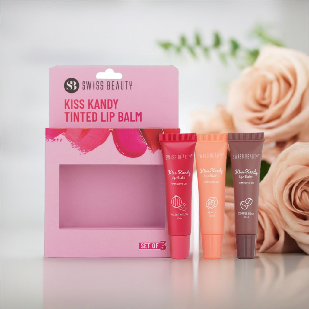 Experience a blissful treat for your lips with the Swiss Beauty Kiss Kandy Lip Balm Pack of 3, and enjoy the delectable flavors of Peach, Watermelon, and Coffee.