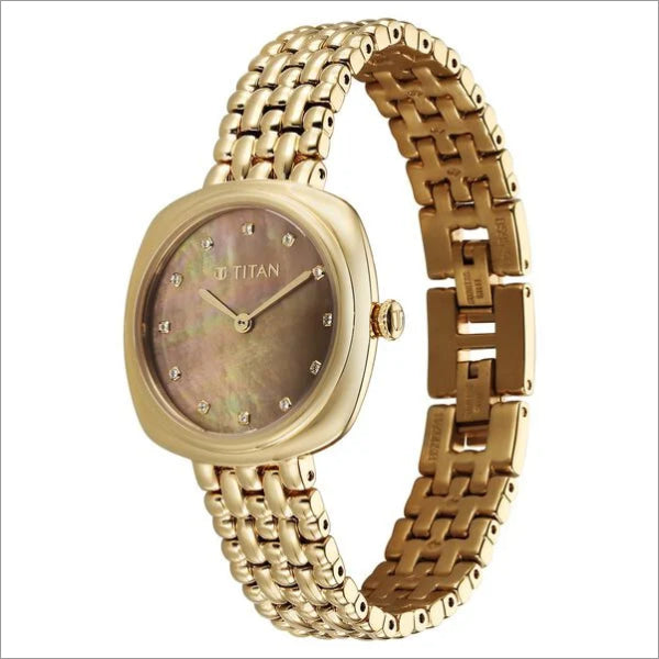 Introducing the Titan Aura Quartz Analog Brown Mother of Pearl Dial Golden Stainless Steel Strap Watch for Women, a perfect blend of elegance and functionality. This exquisite timepiece is designed for the modern woman who values both style and reliability. With its stunning mother of pearl dial and luxurious golden stainless steel strap, this watch is not just an accessory but a statement piece that elevates any outfit.