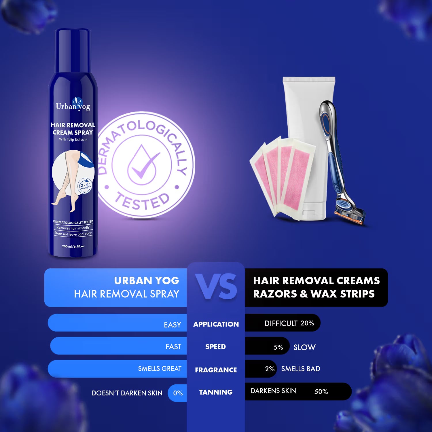 Discover the ultimate solution for hair removal for women with UrbanYog Hair Removal Cream Spray. This 200ml spray is expertly crafted to provide an easy, painless, and quick hair removal experience, tailored specifically to meet the needs of modern women. Leave behind the painful waxing sessions and the risks of cuts from traditional shaving methods.