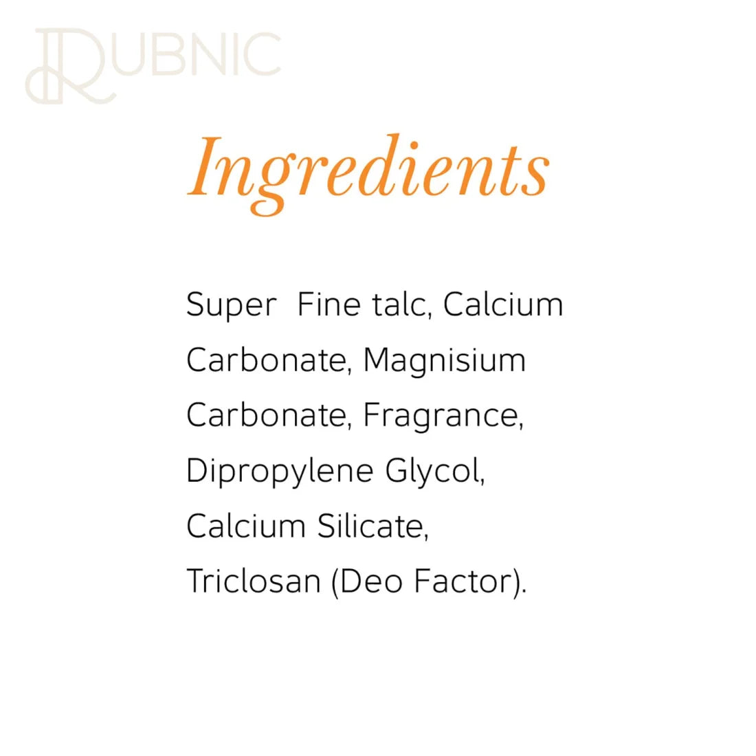 Super Fine talc, Calcium Carbonate, Magnesium Carbonate, Fragrance, Dipropylene Glycol, Calcium Silicate, Triclosan (Deo Factor)